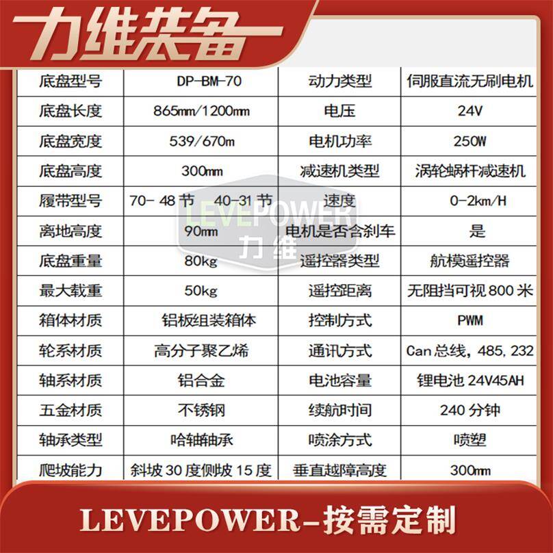 履帶底盤長668mm,履帶底盤寬550mm,履帶底盤高242mm,無線遙控履帶底盤箱體采用鋼板材質焊接而成,防腐性能好。履帶底盤動力采用48V500W直流無刷電機,渦輪蝸桿減速機動力更強,轉彎靈活。履帶底盤電池采用48V20AH鋰電池,續航時間更長,是一款不錯的機器人橡膠履帶。
