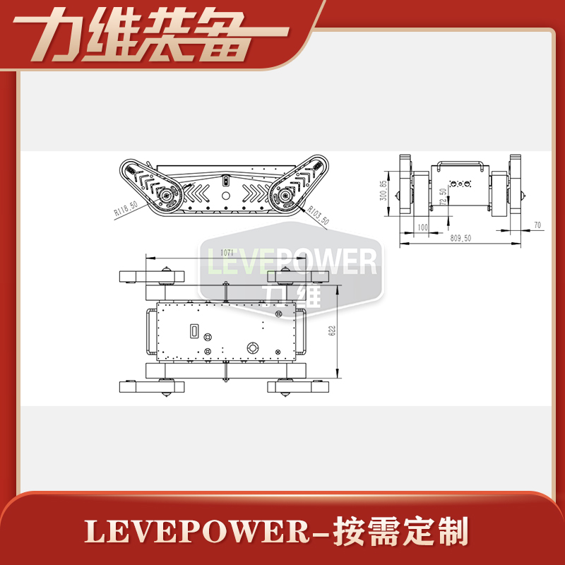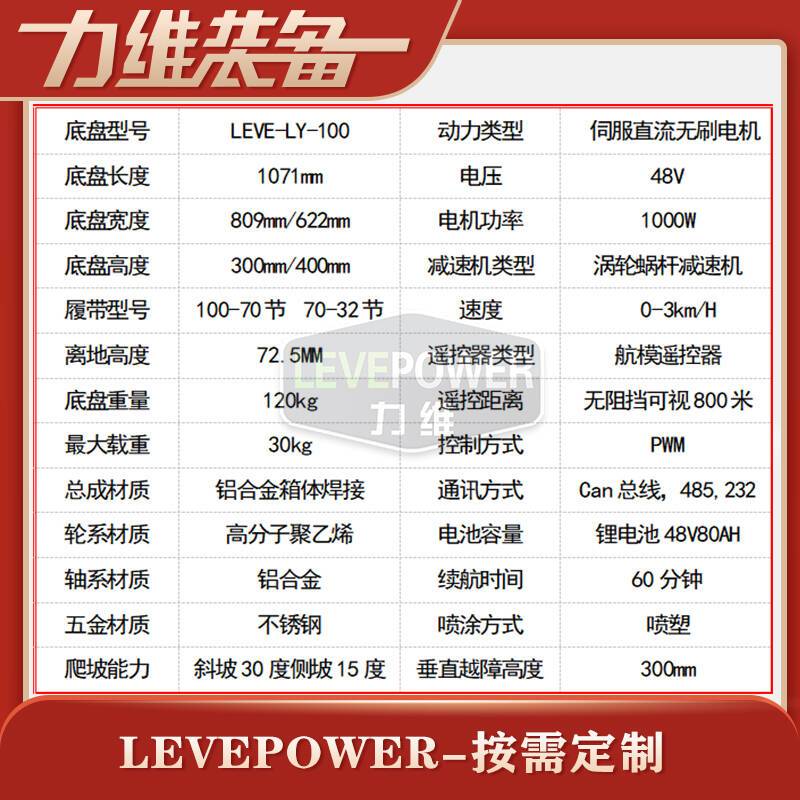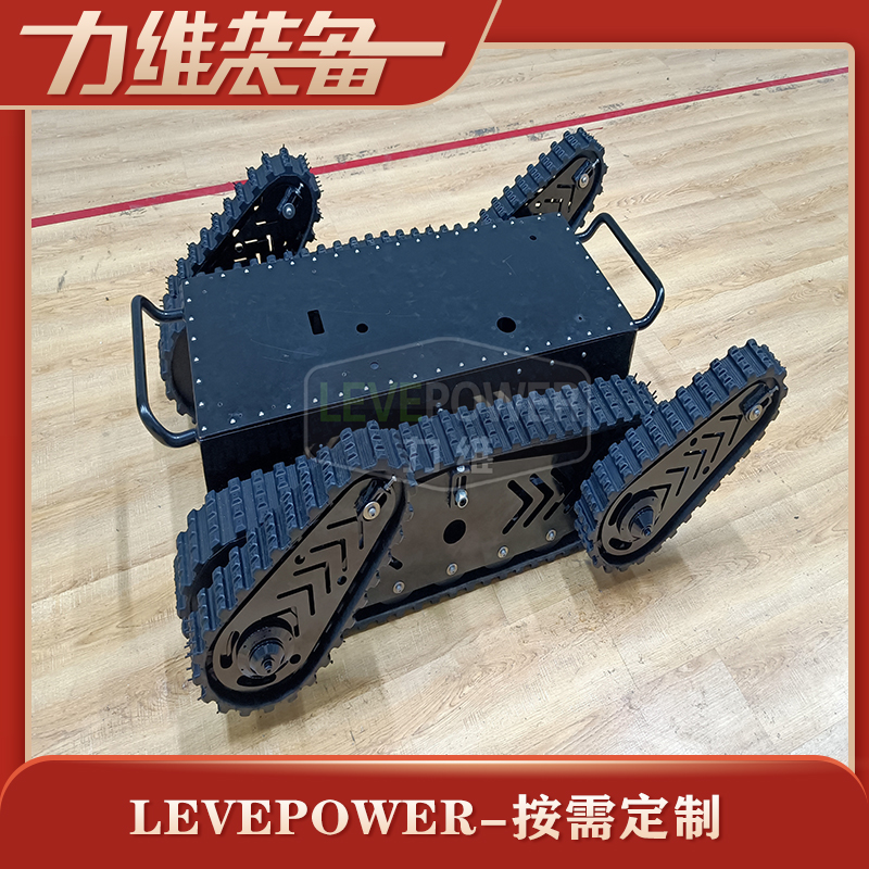 DP-LY-100主體履帶選擇100mm寬度履帶,擺臂履帶選擇70mm寬度履帶,橡膠履帶采用天然橡膠加凱夫拉纖維高溫硫化而成,輪子采用高分子聚乙烯材質(zhì),耐磨性能強(qiáng),橡膠履帶合理的橫紋設(shè)計(jì),越野性能更強(qiáng),是一款不錯(cuò)的履帶越野底盤。特種橡膠履帶底盤長(zhǎng)1071mm,履帶底盤寬809mm,履帶底盤高300mm,無(wú)線遙履帶底盤搭載48V1KW直流無(wú)刷電機(jī),RV50渦輪蝸桿減速機(jī),動(dòng)力更強(qiáng)。擺臂部分采用2個(gè)1kw的直流無(wú)刷電機(jī),履帶底盤采用48V80AH鋰電池,續(xù)航時(shí)間60分鐘。四驅(qū)履帶越野底盤,動(dòng)力更強(qiáng)。爬樓履帶機(jī)器人底盤,前后擺臂設(shè)計(jì),不僅外觀漂亮,越野性能更強(qiáng),爬樓性能更穩(wěn)定。履帶底盤框架采用鋁合金箱體焊接而成,底盤承載力大,是一款全地形履帶底盤.
