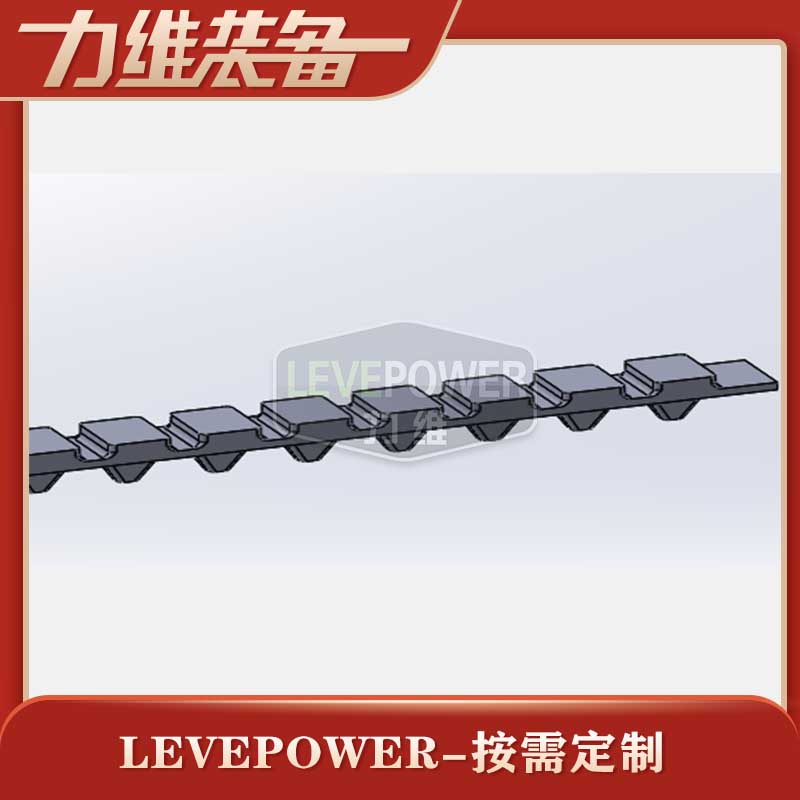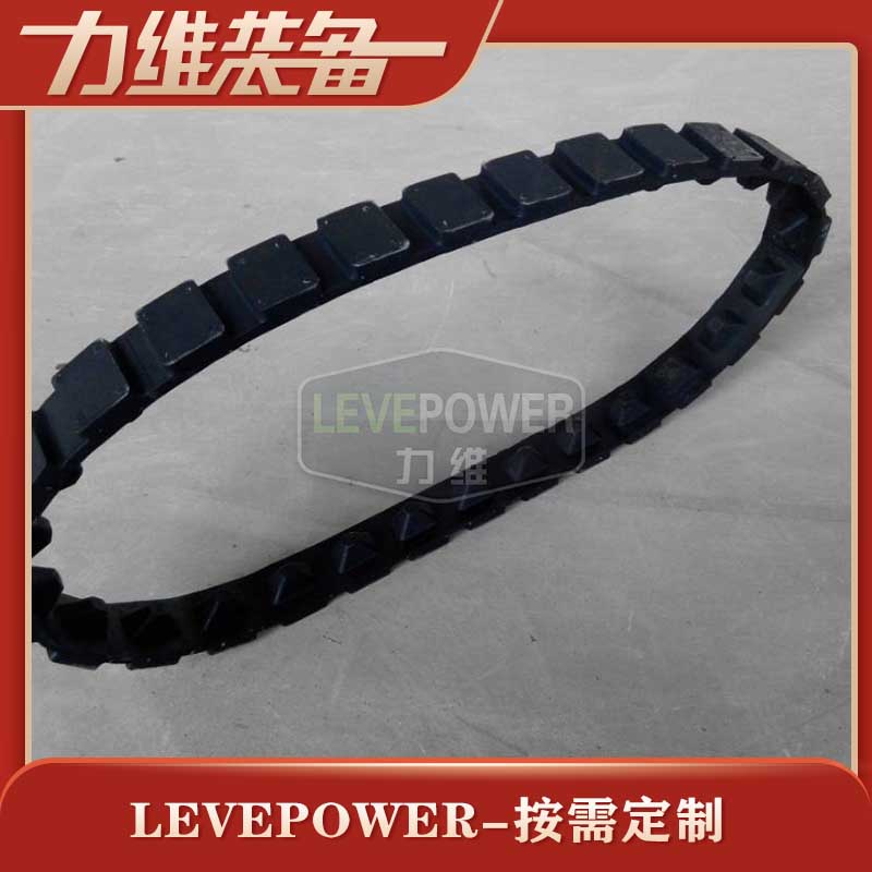此履帶為撥齒履帶,外花紋采用方塊矮齒緊密設(shè)計(jì),內(nèi)齒采用節(jié)距適中的三角塊狀設(shè)計(jì),帶體較厚,此款設(shè)計(jì)提高了履帶自身的載重能力,實(shí)現(xiàn)了在路面行駛非常平穩(wěn)功能。