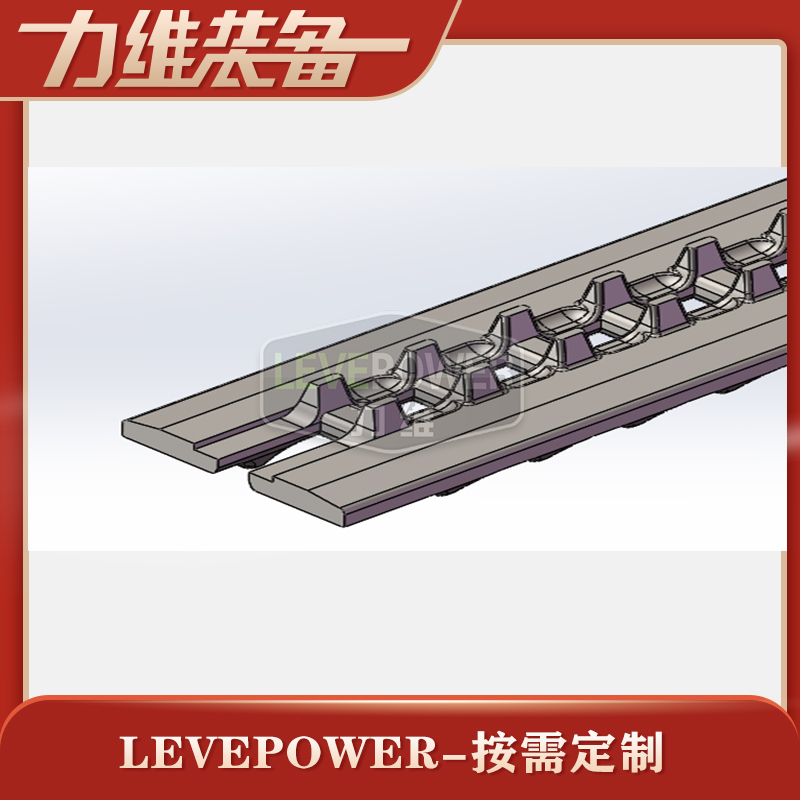 履帶內(nèi)齒采用高齒梯形設(shè)計(jì),內(nèi)置鑄鋼件,外花紋采用塊狀對(duì)稱花紋,此設(shè)計(jì)大大提高了此款履帶的抓地力,轉(zhuǎn)彎的時(shí)候大大減小了脫帶機(jī)率。此款特種橡膠履帶帶體較厚,載重力較強(qiáng)。