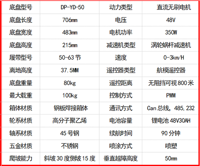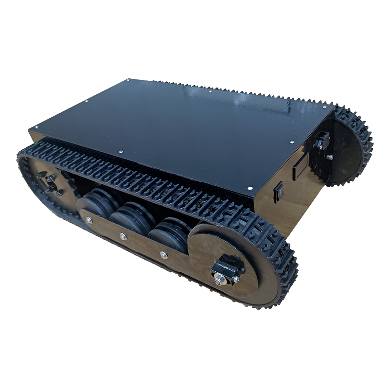 橡膠履帶底盤長(zhǎng)706mm,橡膠履帶底盤寬483mm,橡膠履帶底盤高215mm,無(wú)線航模遙控履帶底盤采用48v350W直流無(wú)刷永磁電機(jī),渦輪蝸桿減速機(jī)動(dòng)力更強(qiáng),轉(zhuǎn)彎靈活,操控簡(jiǎn)單。履帶底盤電池采用48V30AH鋰電池續(xù)航時(shí)間更長(zhǎng)。履帶底盤箱體采用鋼板焊接而成,輪系采用高分子聚乙烯,履帶底盤整體重量輕,耐磨性強(qiáng)。