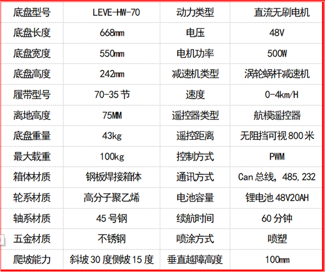 履帶底盤長(zhǎng)668mm,履帶底盤寬550mm,履帶底盤高242mm,無線遙控履帶底盤箱體采用鋼板材質(zhì)焊接而成,防腐性能好。履帶底盤動(dòng)力采用48V500W直流無刷電機(jī),渦輪蝸桿減速機(jī)動(dòng)力更強(qiáng),轉(zhuǎn)彎靈活。履帶底盤電池采用48V20AH鋰電池,續(xù)航時(shí)間更長(zhǎng),是一款不錯(cuò)的機(jī)器人橡膠履帶。